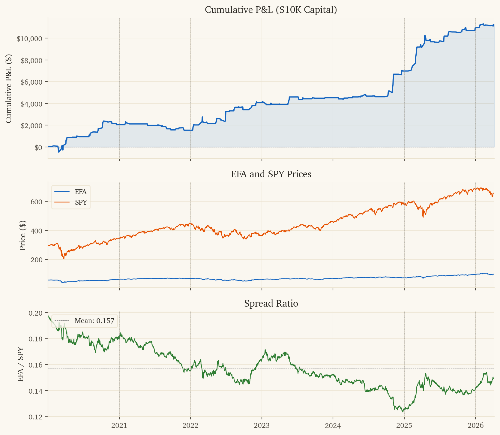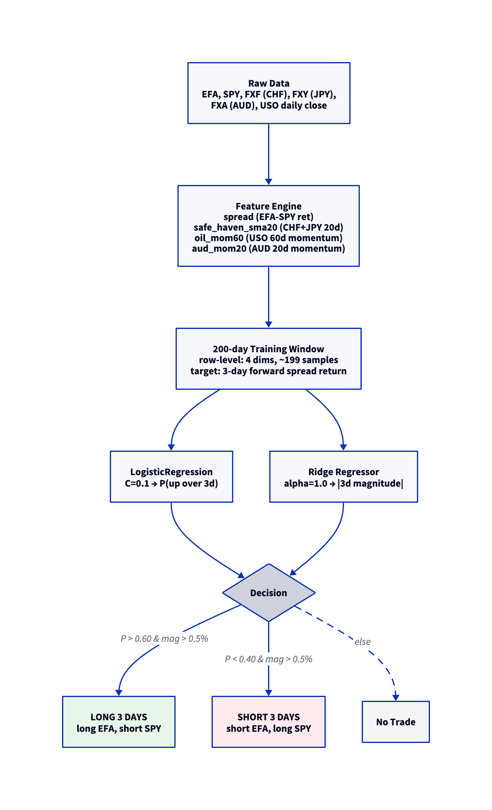 This document presents a systematic pairs trading strategy on EFA (iShares MSCI EAFE – international developed equities) vs SPY (S&P 500 – US equities). The strategy predicts 3-day forward returns of the EFA-SPY spread using safe-haven currency flows, oil momentum, and AUD momentum as signals.