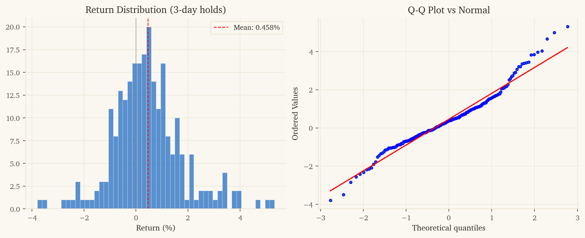 3-day holding period: Geographic equity rotation is slower than commodity-equity divergence. Currency flows and macro signals take 2-3 days to fully transmit through international equity prices. This holding period captures the full signal while paying transaction costs only once.