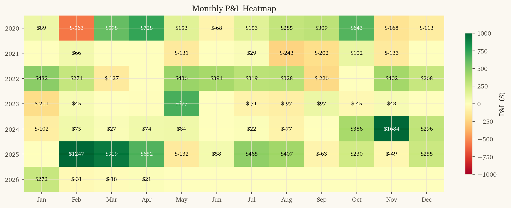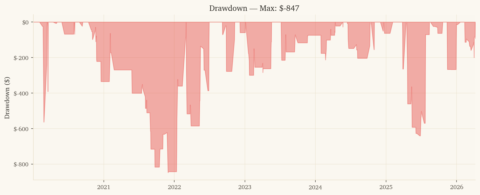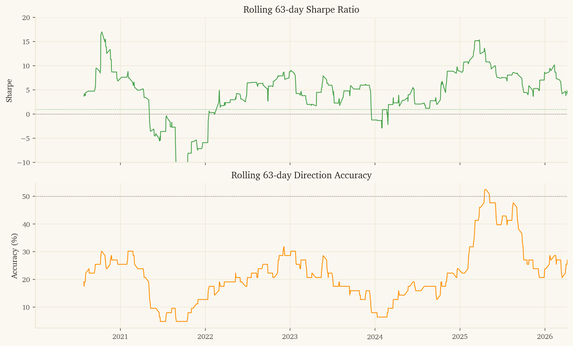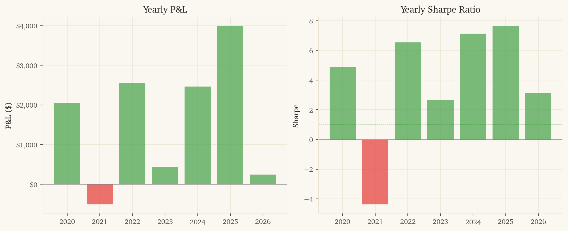 2021 is a losing year (-$508, Sharpe -4.37). Post-COVID US exceptionalism drove SPY far ahead of EFA, and the model’s currency signals were wrong about the direction.