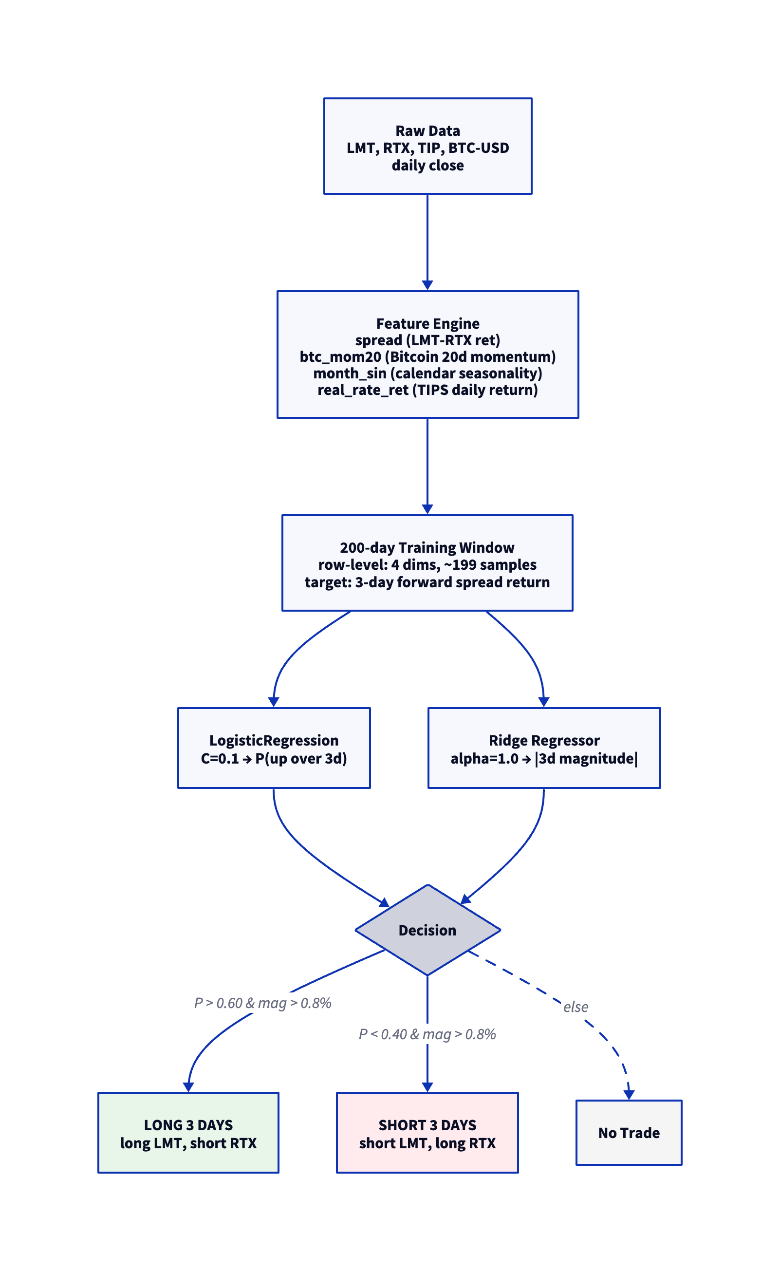 This document presents a systematic pairs trading strategy on LMT (Lockheed Martin) vs RTX (Raytheon Technologies). Both are prime defense contractors but have meaningfully different exposure profiles. The strategy predicts 3-day forward returns of the LMT-RTX spread using Bitcoin momentum, calendar seasonality, and TIPS real-rate signals.