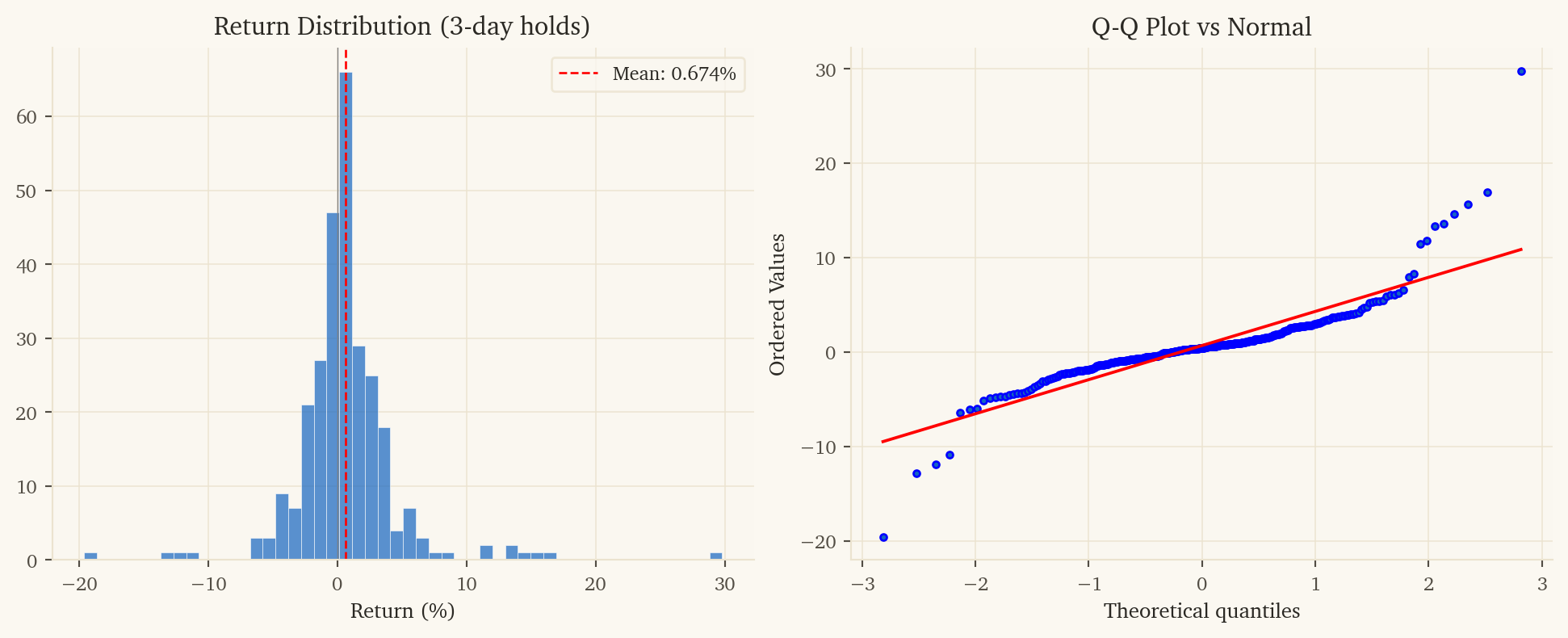 4. 3-day holding period: Defense sector signals propagate slowly through earnings revisions, contract announcements, and budget headlines. Multi-day hold captures the full move while paying transaction costs once.