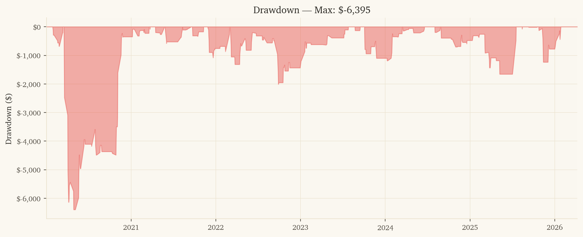 ax.set_title(f'Drawdown — Max: ${df["drawdown"].min():,.0f}')