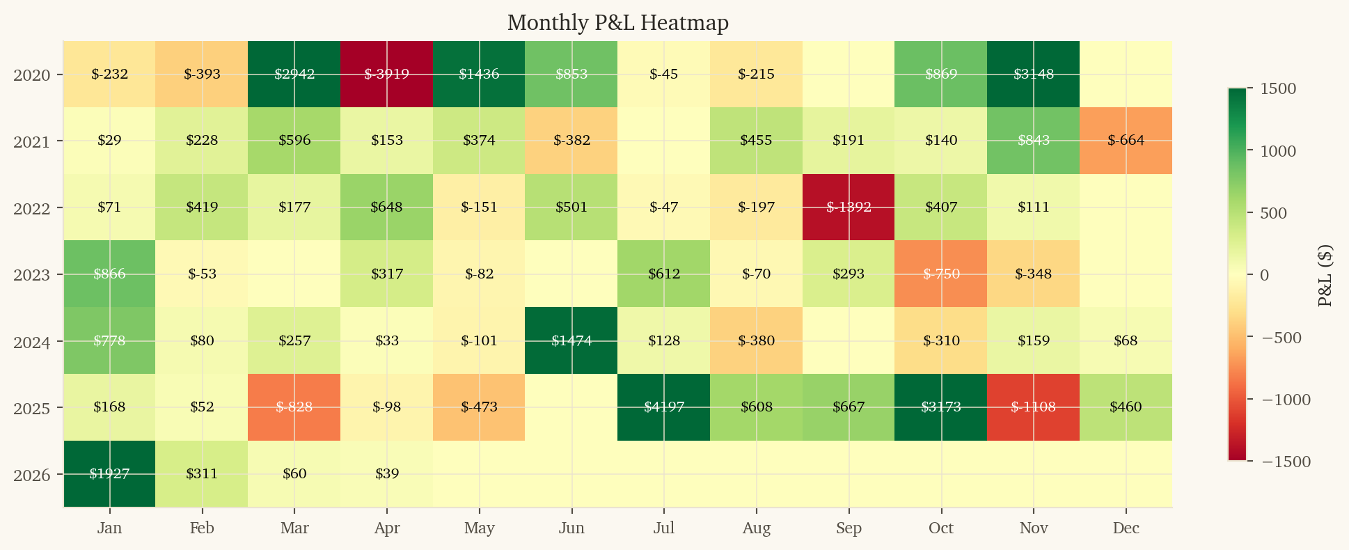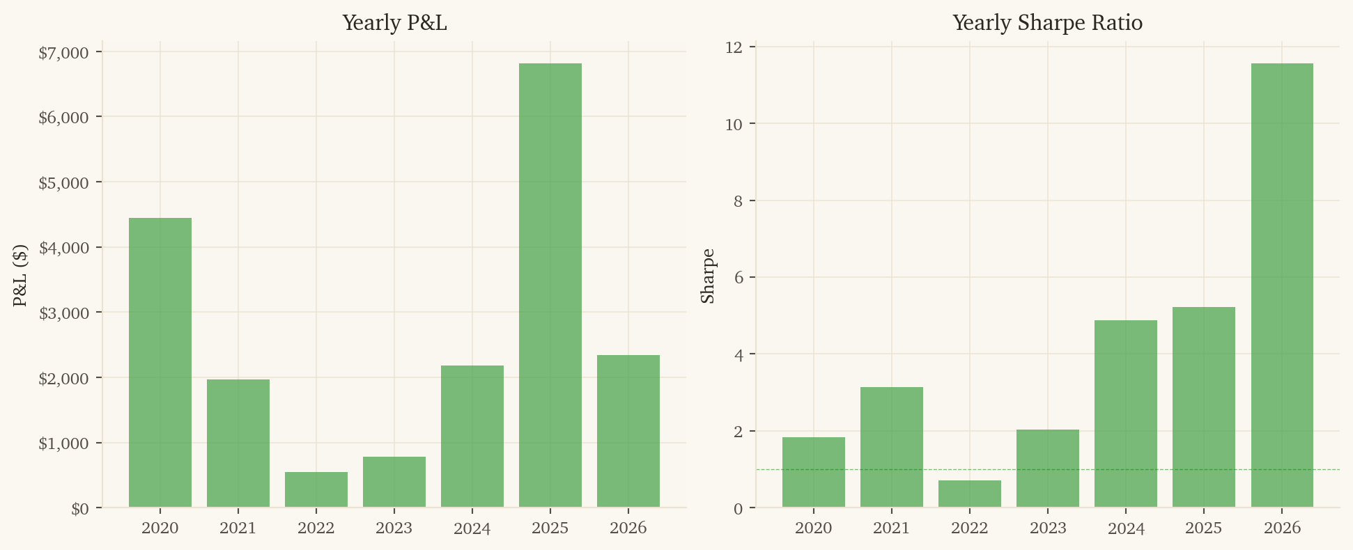 3. 2022 was a near-miss year (only $547 PnL). The model can have lean years; smaller drawdowns are tolerable when other sleeves are paying.