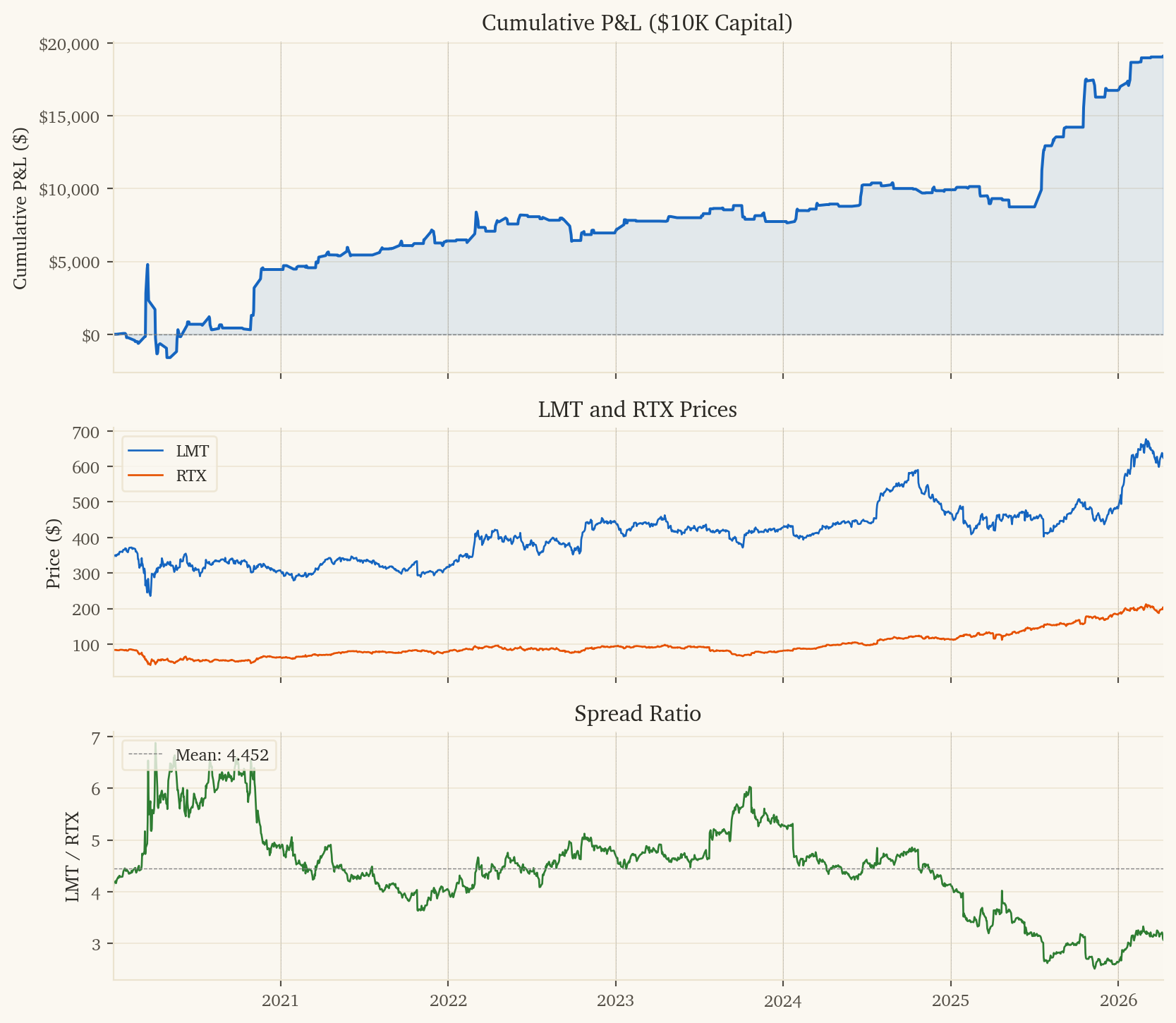 Figure 1: Cumulative P&L (top), LMT and RTX prices (middle), and spread ratio (bottom)