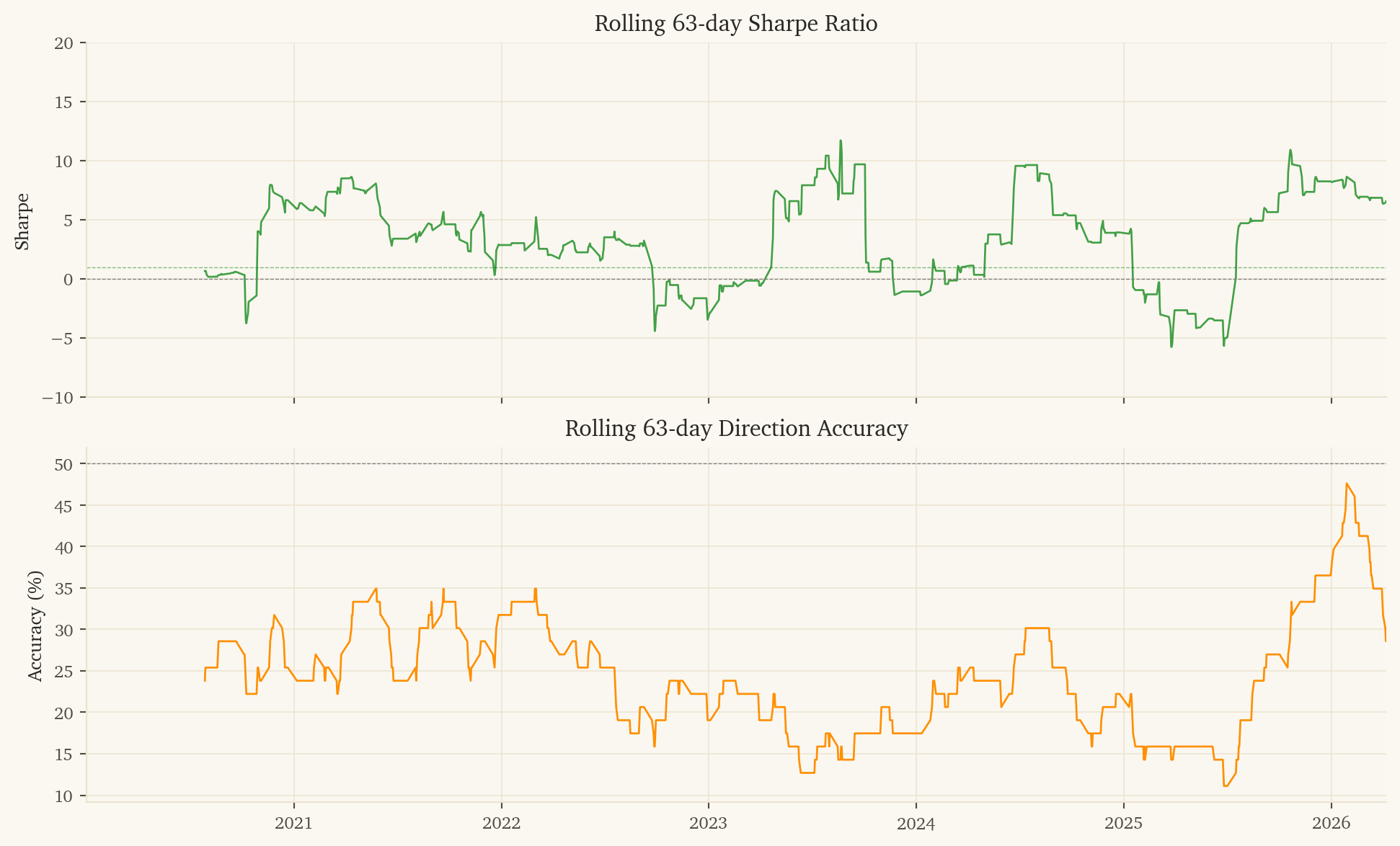 2. 283 trades over 6.3 years (~45/year). Statistical confidence on 59.7% accuracy with 283 trades has a 95% CI of roughly 54-65%.