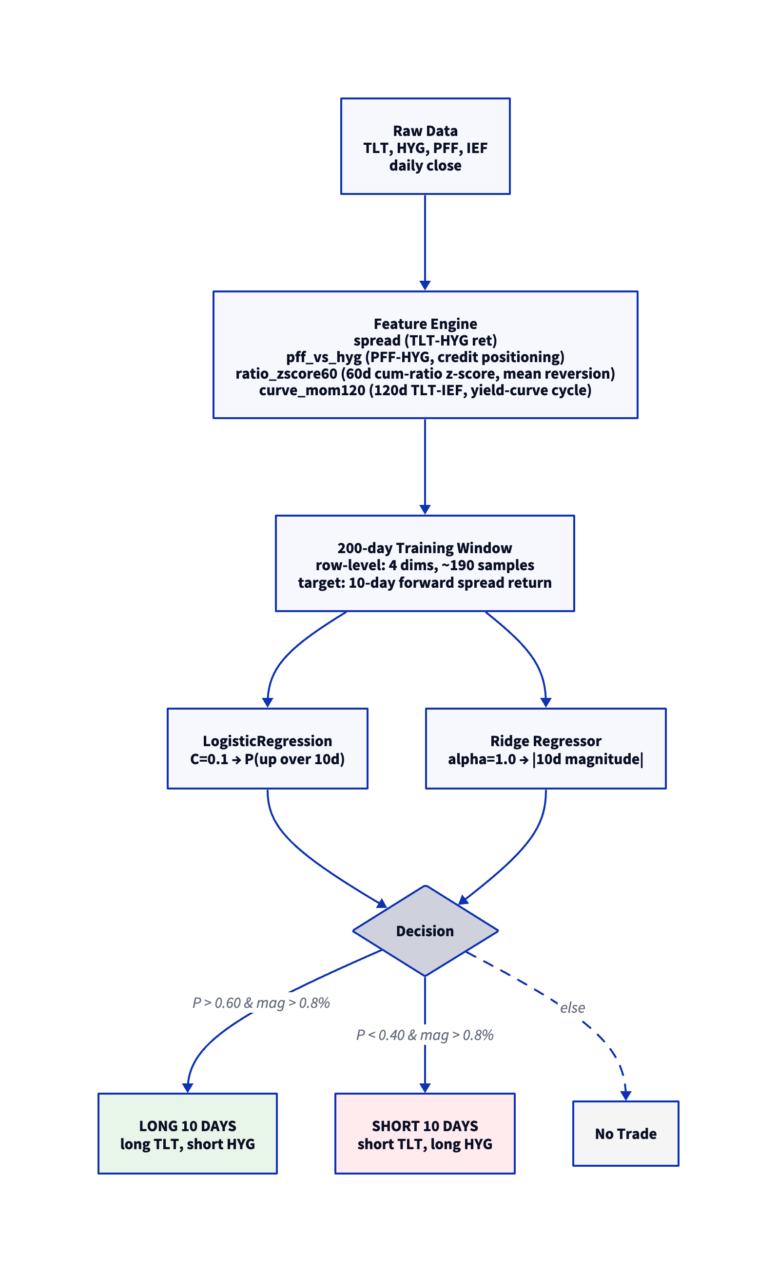 This document presents a systematic pairs trading strategy on TLT (iShares 20+ Year Treasury Bond ETF) vs HYG (iShares iBoxx High-Yield Corporate Bond ETF). The strategy predicts 10-day forward returns of the TLT-HYG spread using credit positioning, mean-reversion, and yield-curve cycle signals.