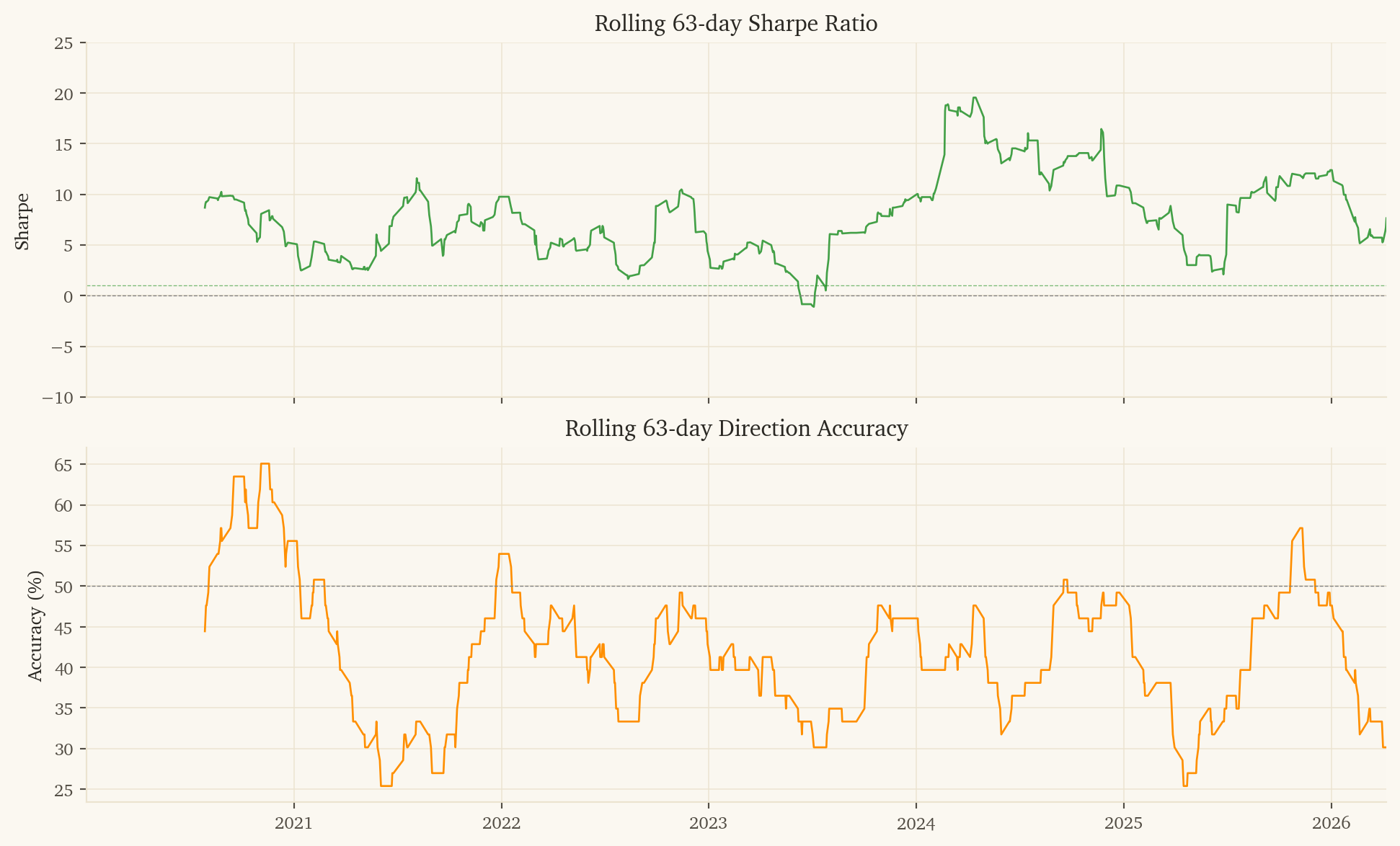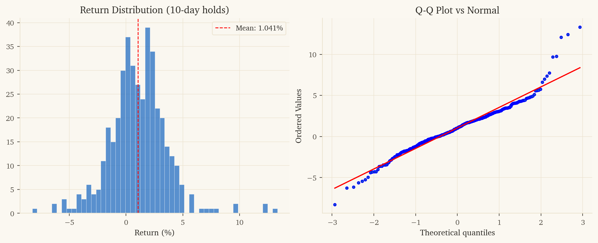 Enter when the model predicts a 10-day spread move exceeding 0.8%. Hold for 10 trading days. Each entry incurs one round-trip of transaction costs for 10 days of exposure – a 70%+ reduction in cost drag vs a daily strategy.
