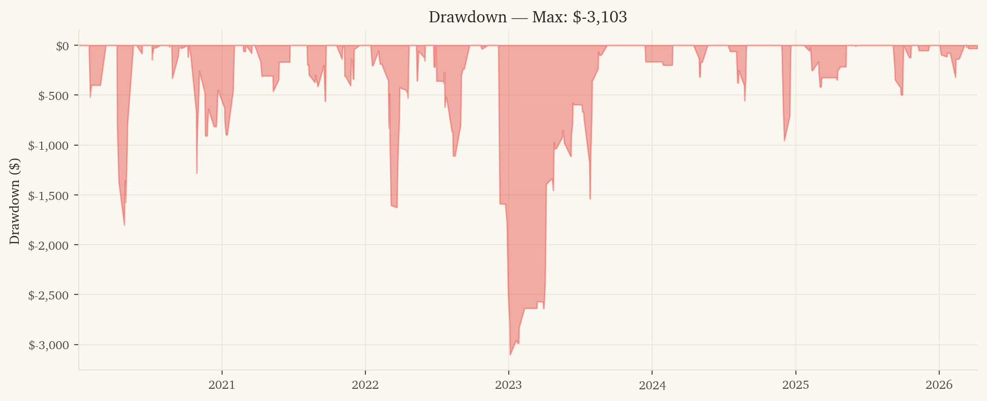High dollar PnL but largest open exposure: 10-day hold periods mean the strategy is in position ~80% of the time. Capital is consistently deployed (vs daily-hold sleeves that are flat 50%+ of days).