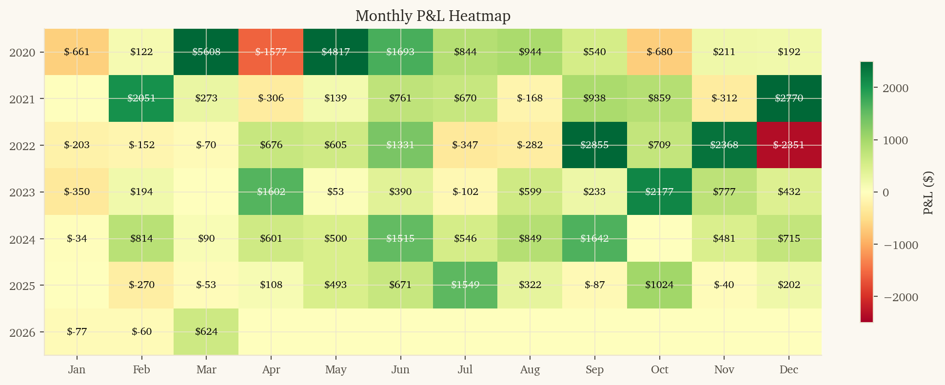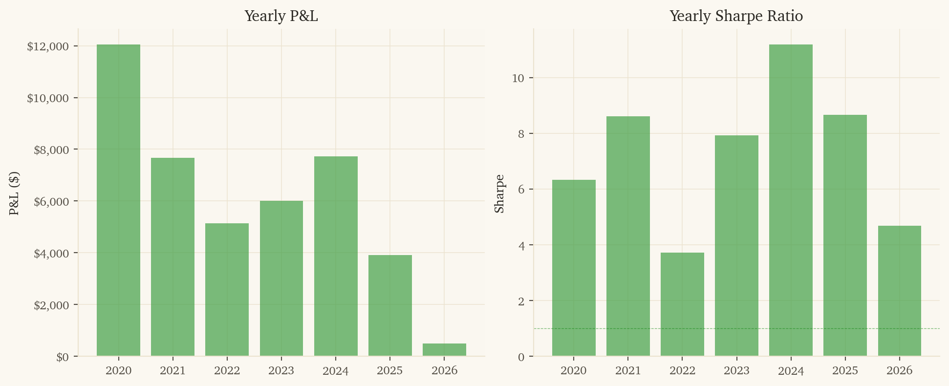 This is the highest-PnL strategy in the portfolio and is profitable in every calendar year tested.