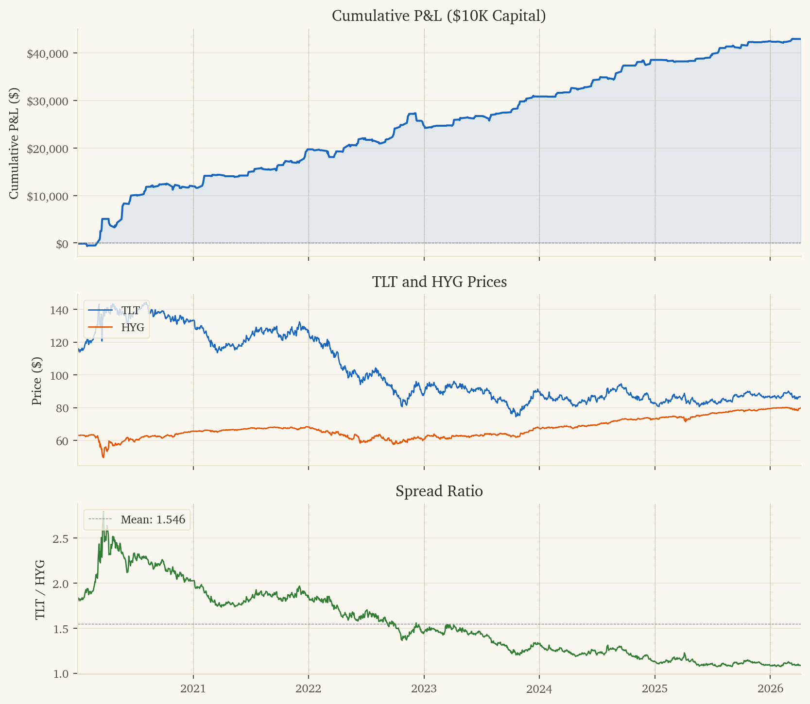 Mean reversion (60d cumulative-ratio z-score): TLT-HYG cumulative spreads have strong mean-reverting properties on multi-week scales. When the cumulative spread is multiple standard deviations from its 60-day mean, reversion typically pays.